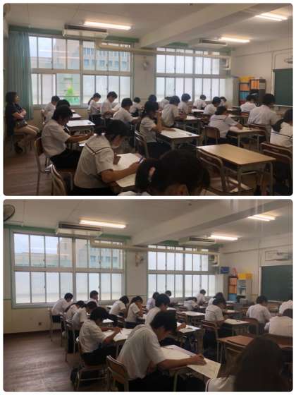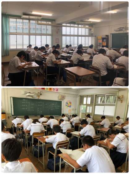 2年生は課題テストに取り組んでいます。普段の定期テストは3時間で終了しますが、本日は5時間目まで頑張ってもらいます。