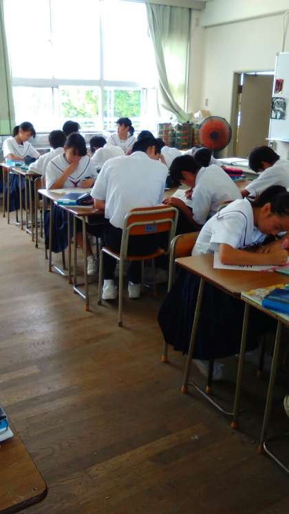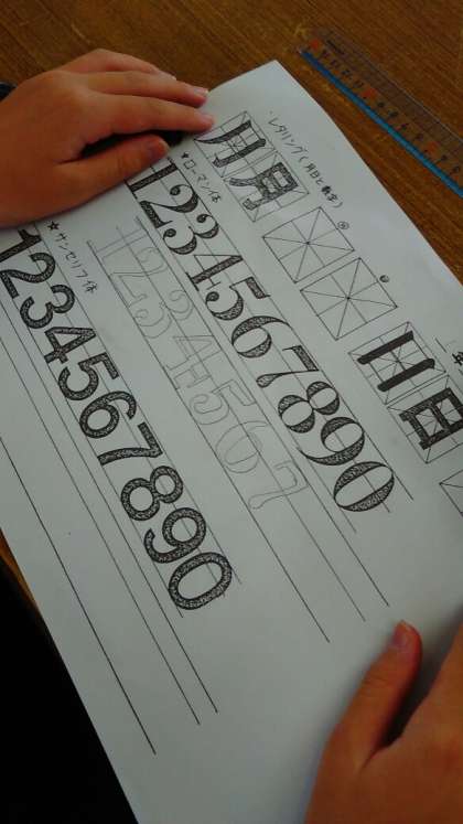 1年3組の美術の時間です。レタリングに取り組んでいます。