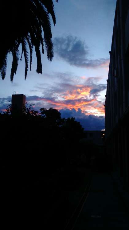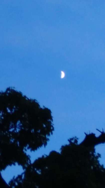 西の空は夕焼け、南の空には月が見えます。明日は今日以上に暑くなりそうです。体調を整えて、週を締めくくりましょう。