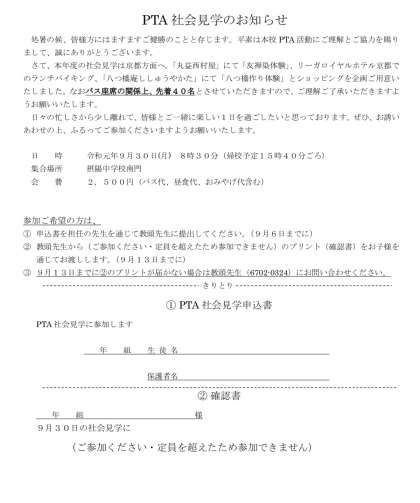 9月30日(月)に実施予定のPTA社会見学は、先日一旦募集を締め切らせていただきました。しかしながら、まだ若干名の空きがございますので、募集を今週20日(金)まで延長いたします。