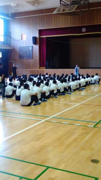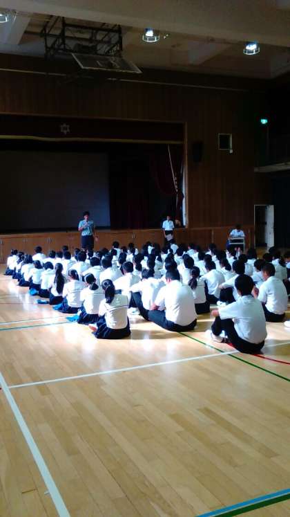 登校時の正門と2年生の朝の学年集会です。