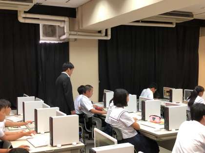 教育実習生が授業をしています。パワーポイントを使って、自分のおすすめのものをみんなに紹介するということをしています。まだスライドショーをするところまでは行ってないようです。