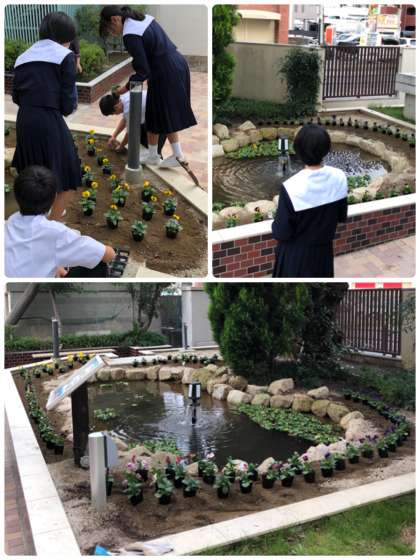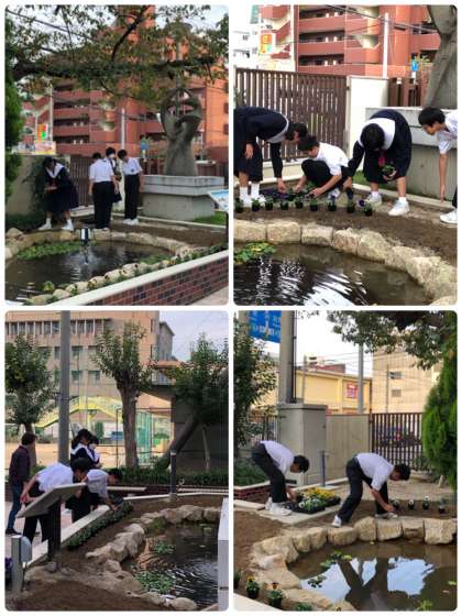 本校のPTA新聞が、平野区PTA協議会の平成30年度PTA新聞作品展において優秀作品賞をいただいたことにより、池の周りにお花を植えていただくことになりました。