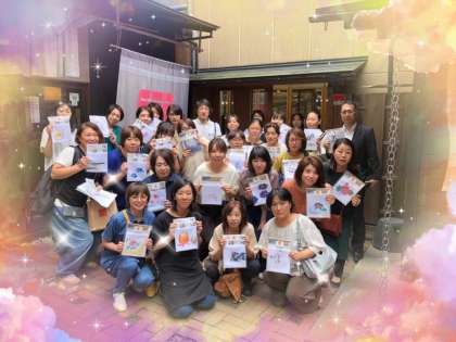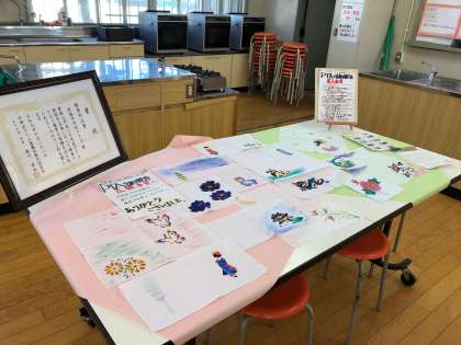 家庭科調理室にはPTAの展示も展示しています。9月30日の社会見学での京友禅体験の作品です。