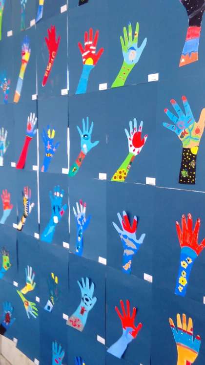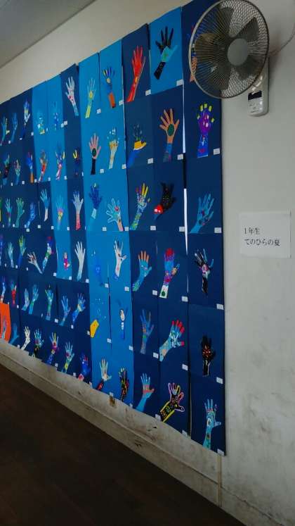美術科、1年生の作品です。手のひらに色々な夏を描いています。