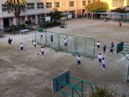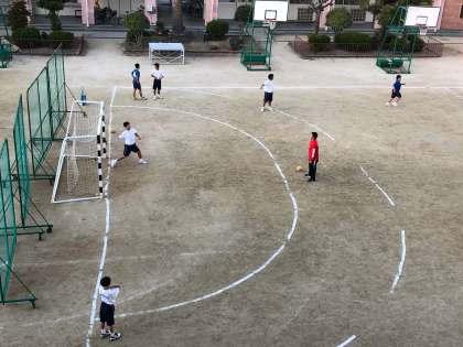 校舎から中庭を見下ろすと、女子バスケットボール部、男子バスケットボール部、ハンドボール部が練習をしています。