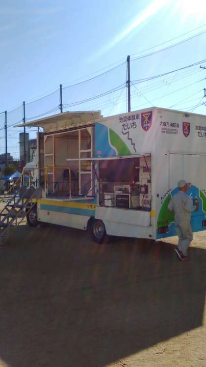 災害に備えて、避難訓練、避難所開設訓練が行われています。起震車、給水車、水消火器などを体験しています。
