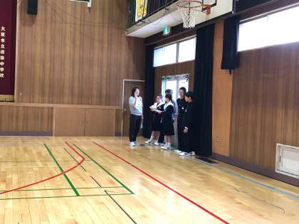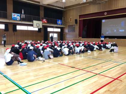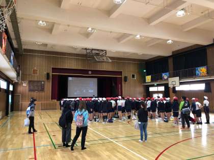体育館に両校集合しました。列を整えて、挨拶をしました。とても元気よく挨拶ができました。