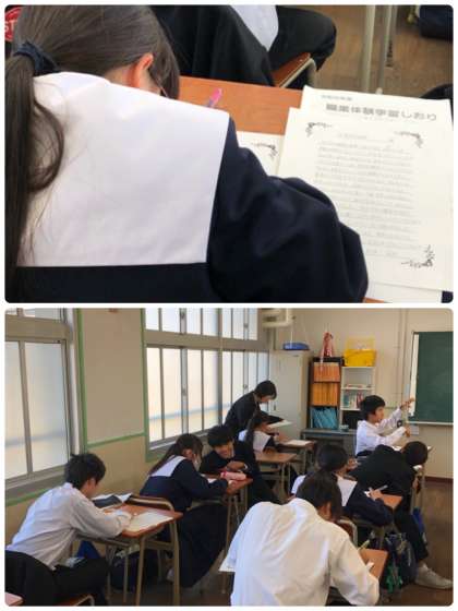 6時間目、2年生は先日の職場体験でお世話になった事業所さんにお礼の手紙を書いています。お忙しい中、対応していただきました。感謝の気持ちをしっかり込めて、書き綴ってほしいです。