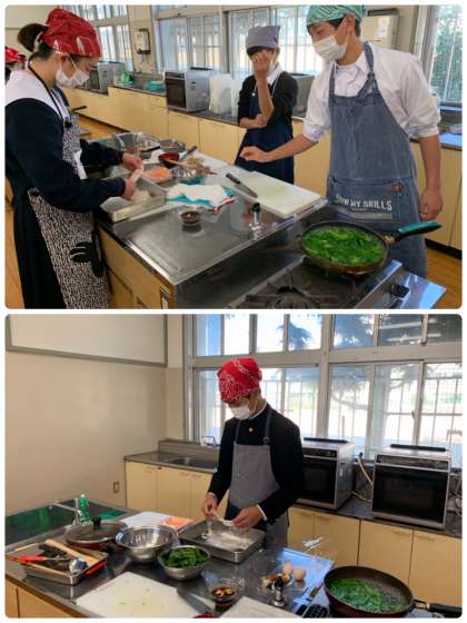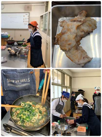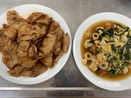 前回はスイートポテトをつくりましたが、今回はぶた肉の生姜焼き、ほうれん草とちくわの玉子とじをつくりました。