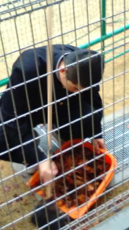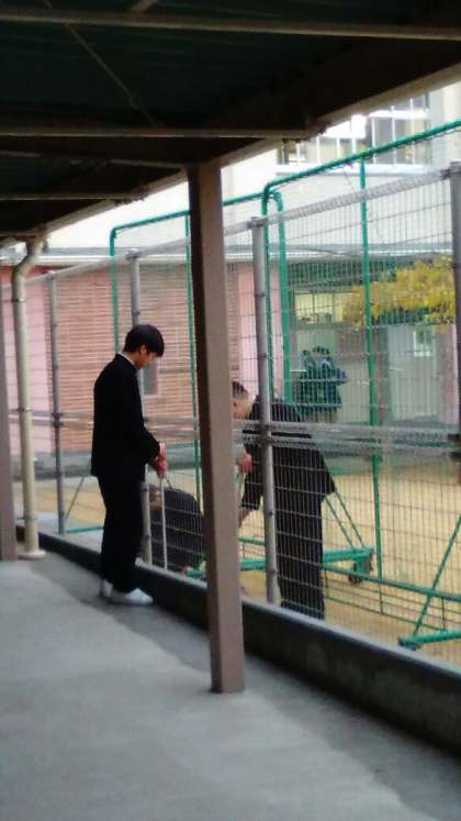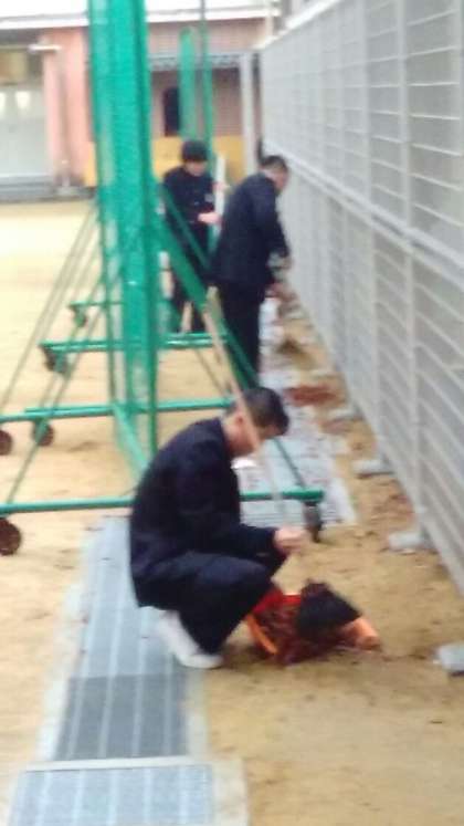 柔道部の生徒が落ち葉清掃をしてくれています。