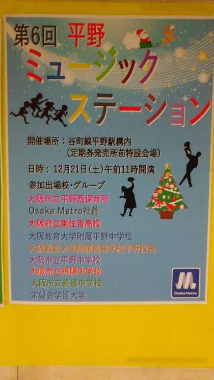 明日、地下鉄平野駅で吹奏楽部が演奏します。