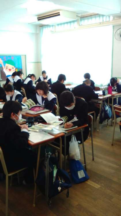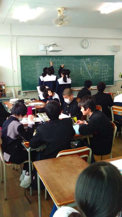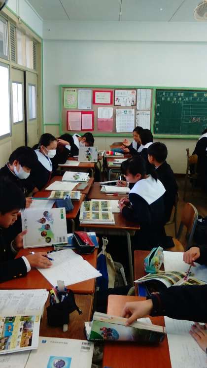 1年4組の社会です。北アメリカの気候と農業の関係をグループ討議をしながら学習しています。
