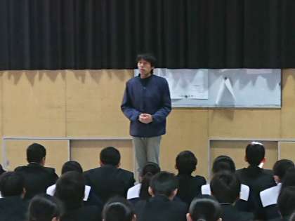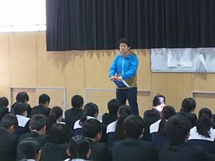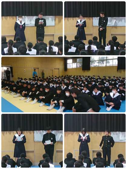 1時間目、格技室で学年集会を行いました。各学級委員長がそれぞれの学級の2学期を振り返りを発表してくれました。