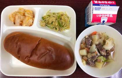 給食では牛肉とウインナー、じゃがいも、キャベツ、にんじん、パセリを使っています。