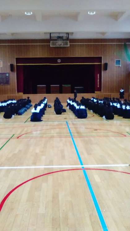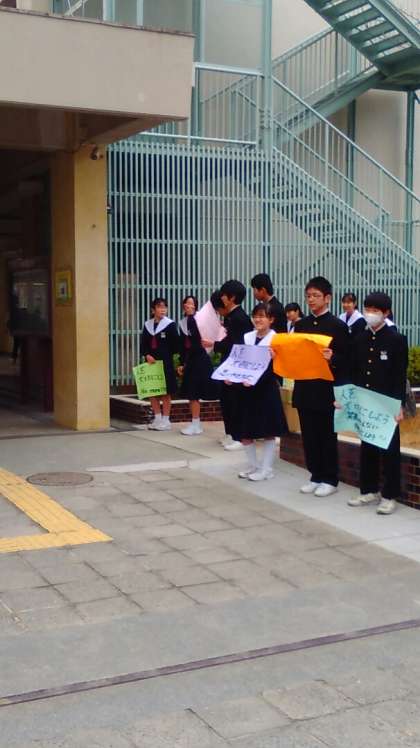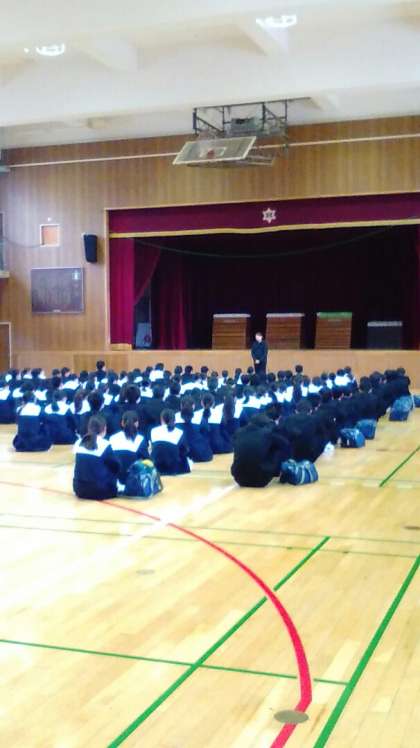 登校時の挨拶運動と3年生の学年集会の様子です。
