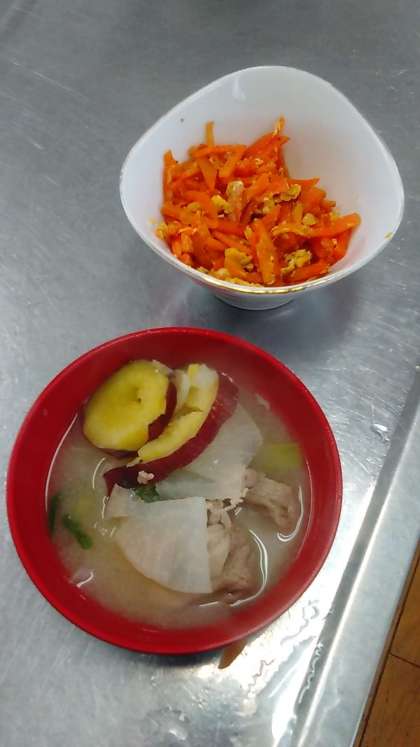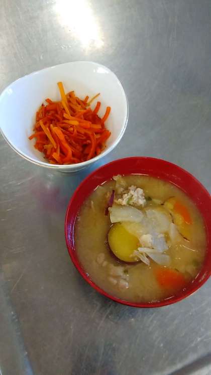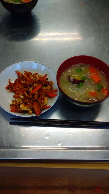 豚汁とにんじんしりしりができました。しりしりとはせん切りという意味の沖縄の方言です。