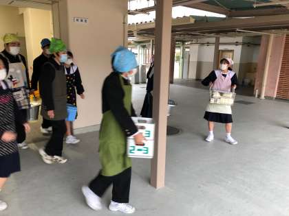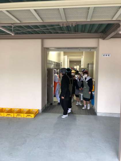 給食室に係の人たちが、食缶や食器を取りに来ている様子です。