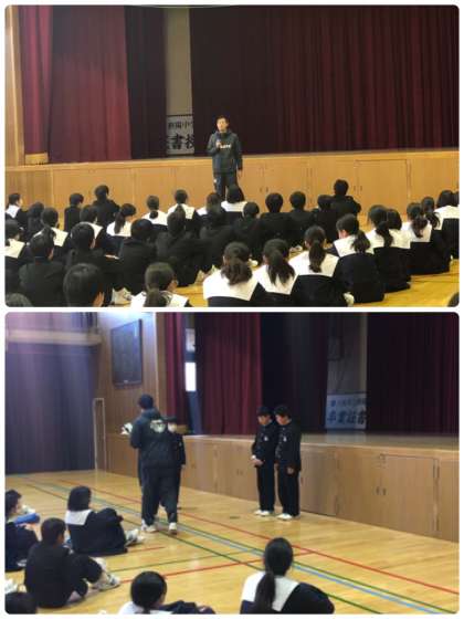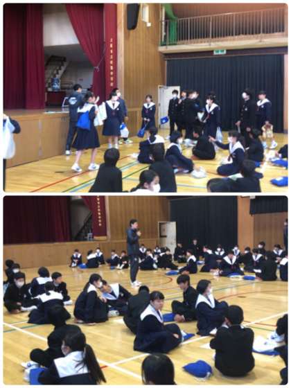 6時間目、体育館で明日の百人一首大会に向けての説明を受け、班の確認もしました。