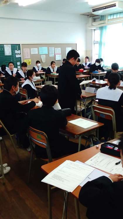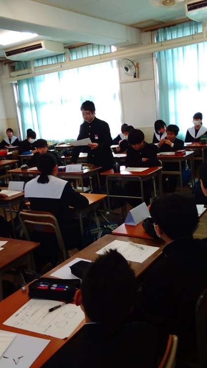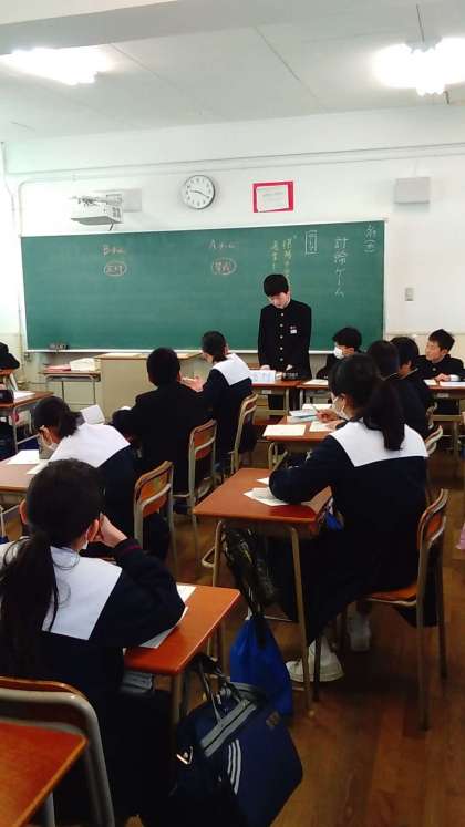 討論ゲームをしています。中学校は自転車通学をしても良いかどうかをテーマに賛成と反対に分かれて討論しています。