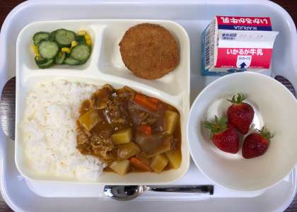 いちごは、ビタミンC、カリウム、食物繊維、葉酸等を多く含む果物です。特にビタミンCが多く、100g中に62mg含まれています。給食でいちごを3個食べると、1食分に必要なビタミンCの約70%をとることができます。