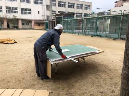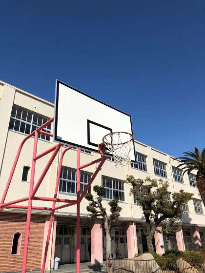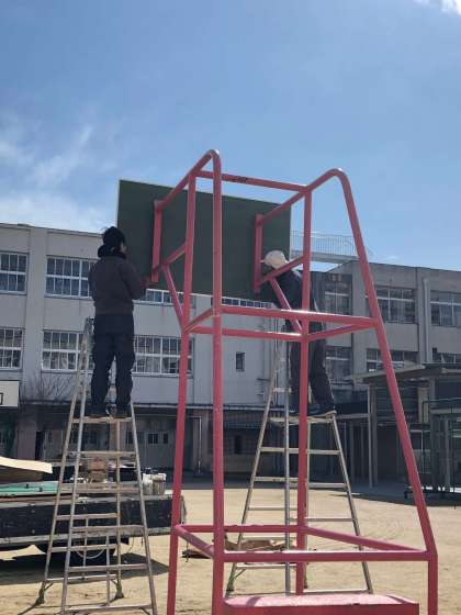 本日、老朽化していた中庭のバスケットゴールのボードを交換してもらいました。