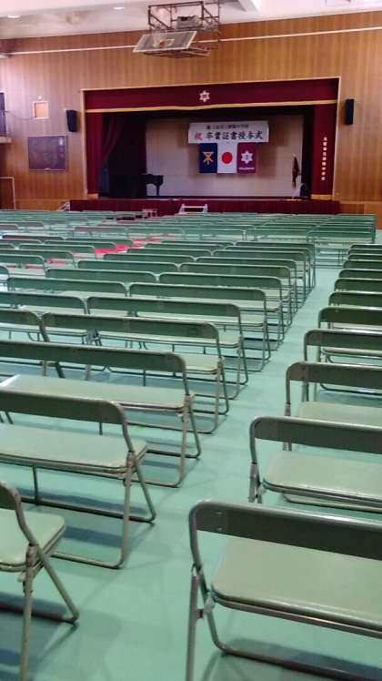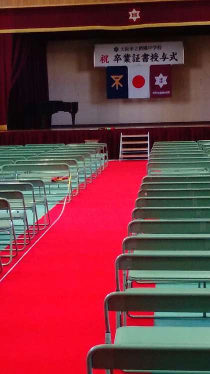 卒業式の会場準備が進んでいます。午後からは細かい準備をします。