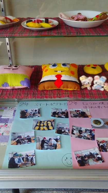昨年度の家庭科の授業での作品や調理実習の様子、家庭科部の作品が展示してあります。