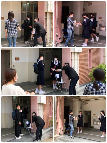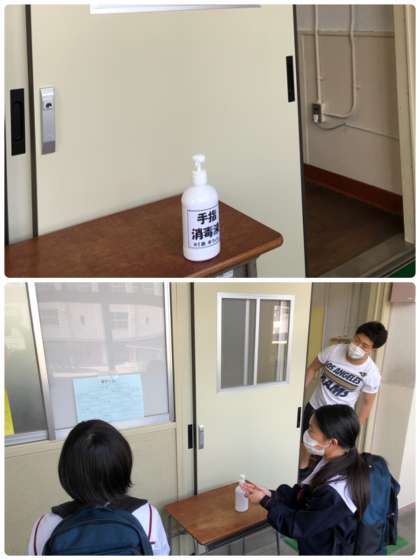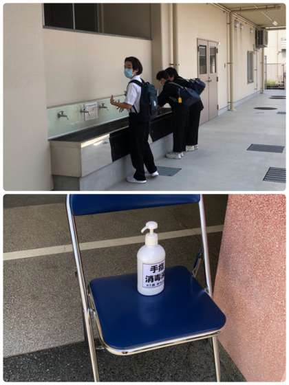 正門をくぐり、各学年の先生と体温や体調を確認し、手洗い、手指の消毒をして各教室に入りました。