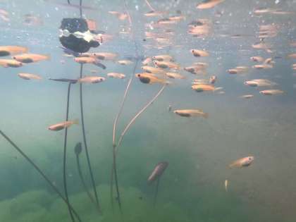 池の中を泳ぐメダカたちです。