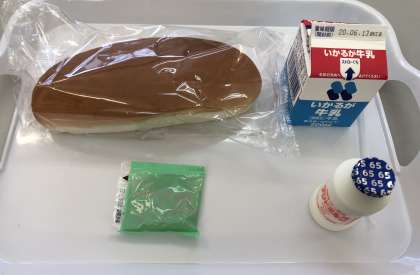 【本日の献立】 コッペパン 牛乳 発酵乳 りんごジャム 本日は、りんごジャムと発酵乳が付いて、4点です。