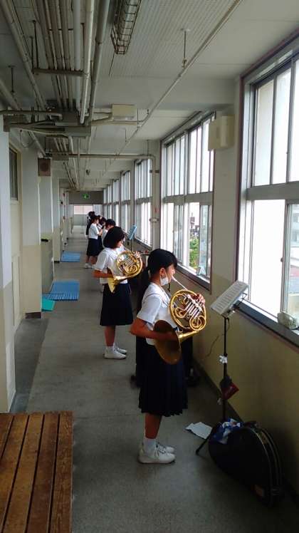 吹奏楽部は間隔をあけて練習です。 楽器の音が放課後の校内に響いています。