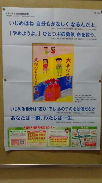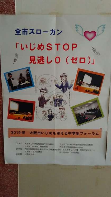 昨年12月のいじめを考える中学生フォーラムで決定したスローガン「いじめSTOP 見逃し0(ゼロ)」は市役所ロビーにも掲示しています。