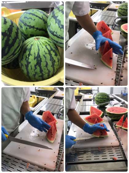 下の写真は、昨日の献立にあったスイカを切り分けているようすです。