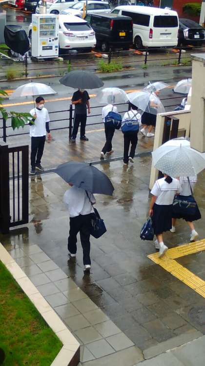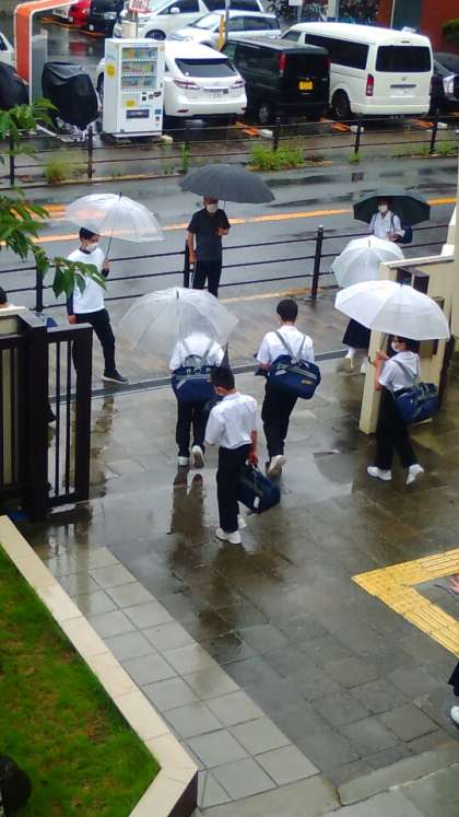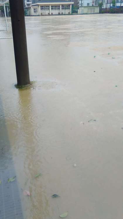 先ほどの強い雨でグランドは水びたし。下校時には弱まっています。