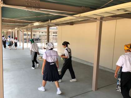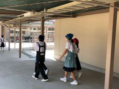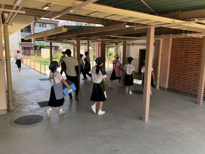 4時間目が終わり、当番の人が給食室に食器や食缶を取りに来ました。