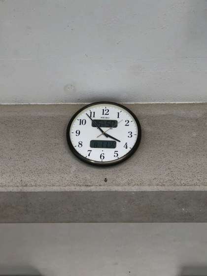 校門付近の時計の温度計は36度4分を示しています。