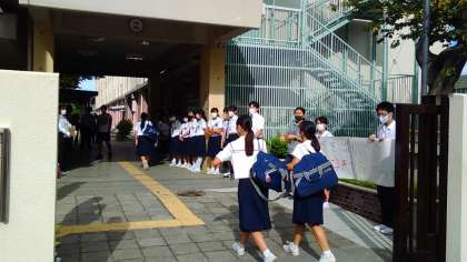 たくさんの人があいさつ運動をしています。