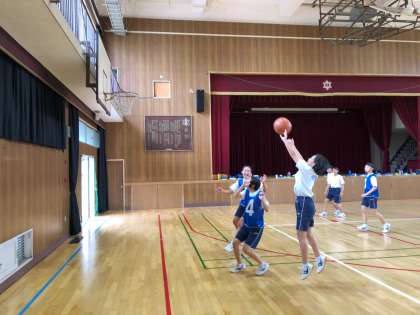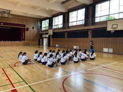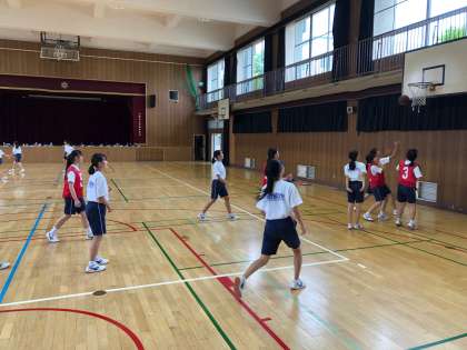 3年3組、4組女子の体育です。体育館でバスケットボールです。