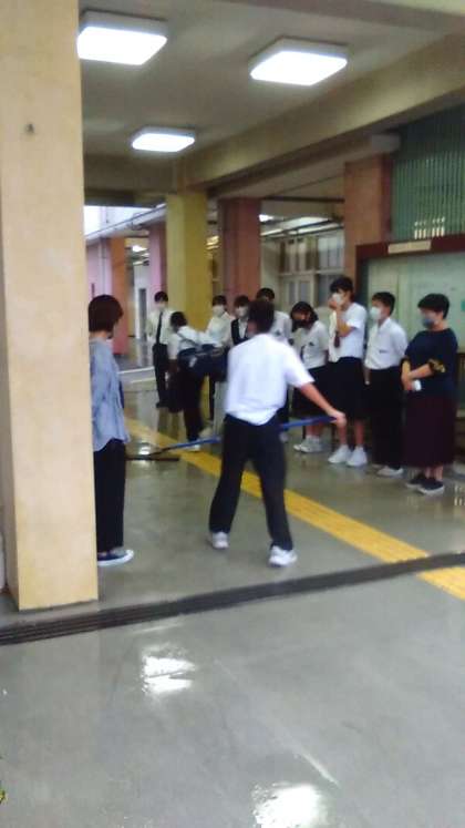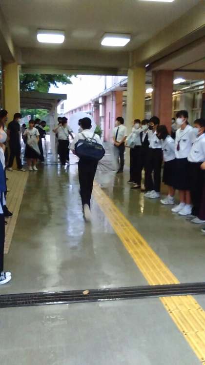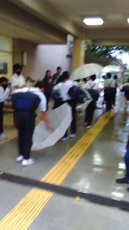 雨のなかの登校です。滑らないよう、水切りをしてくれています。