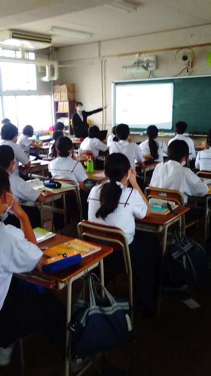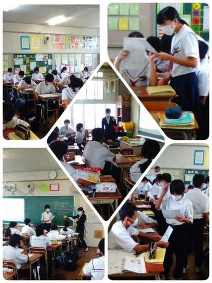 2年3組での教育実習生の英語の授業です。クイズやアクティビティをとりれて楽しく学んでいます。