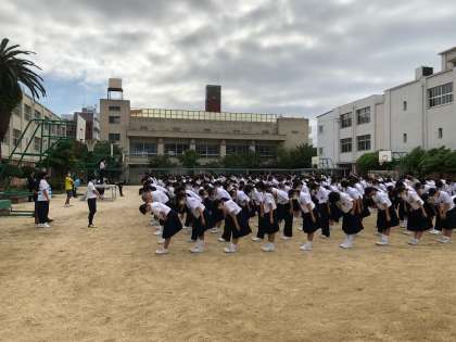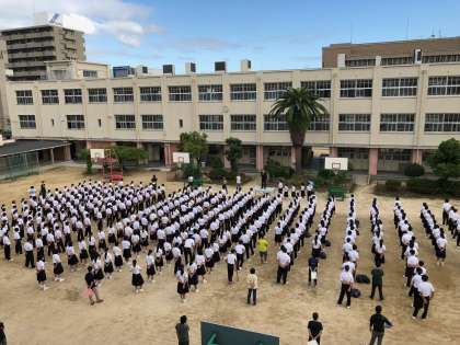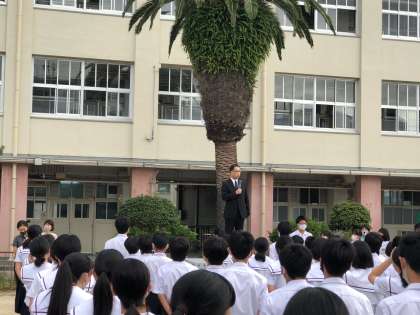 校長先生から「昨日吹奏楽部が堺で演奏会に出演しました。今年度はこれまで演奏会や夏のコンクールなどが全て中止になり、久しぶりの本番になりましたが、素晴らしい演奏を披露してくれ、金賞をいただきました。また、秋季総合体育大会では、本校に部はありませんが、少林寺拳法競技の部でにおいて、1年生と2年生の男子単独演武でそれぞれ1位の成績を収めてくれました。さらに、こんどの10月3日土曜日には、ハンドボール部の大阪市大会決勝戦が住吉スポーツセンターで行われます。2年生大会、3年生大会共に決勝戦まで進んでいますので、こちらも是非頑張ってほしいです。