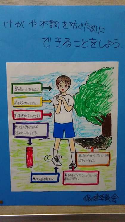 保健委員会のメンバーが、健康についてのポスターをつくって掲示しています。