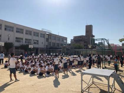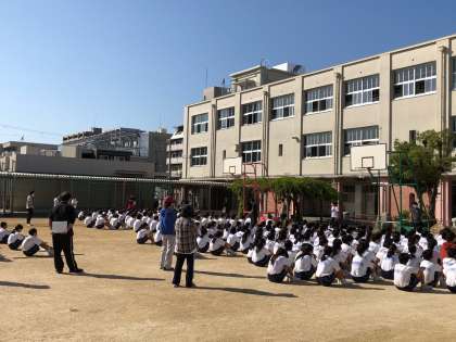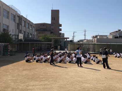 中庭に全学年集まりました。ここから運動場に移動して行進です。