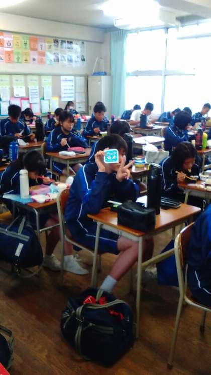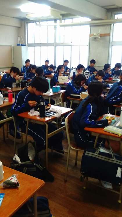 2年生の教室です。今日は体育大会の予定だったので、久しぶりのお弁当です。