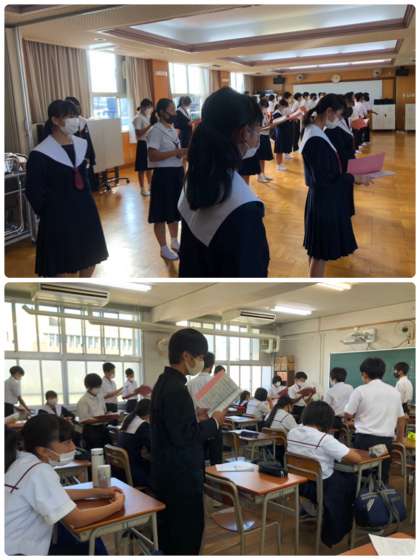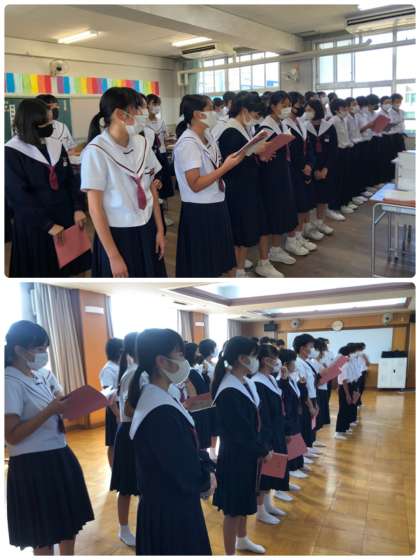6時間目、クラスごとに合唱の練習を行いました。マスクをつけながらですが、できる範囲の練習をしています。