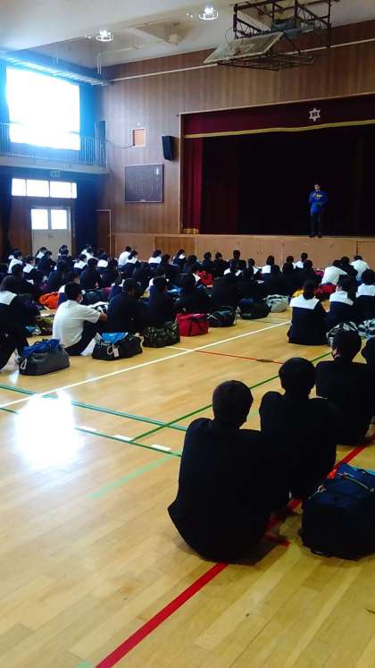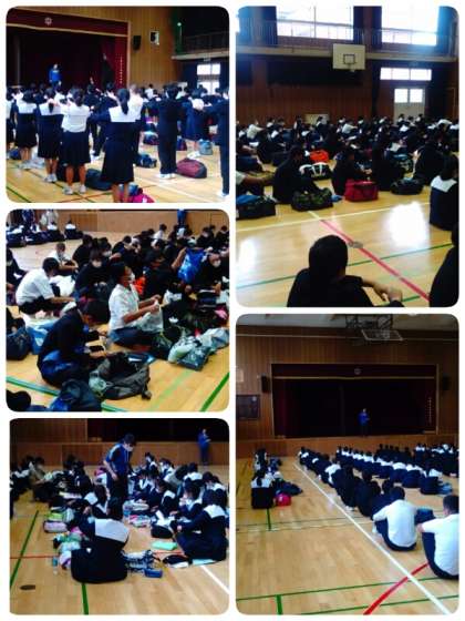 明日から3年生は修学旅行に行きます。4時間目の学年集会で心構えと荷物の確認をしています。