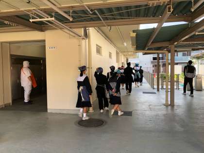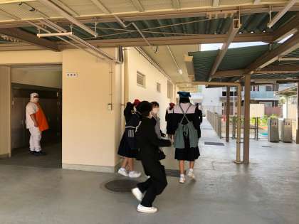 当番の人たちが給食室に食器や食缶を取りに来ました。