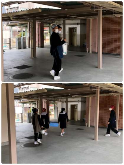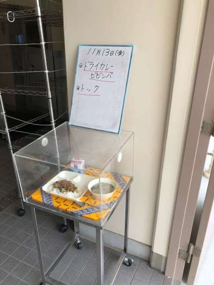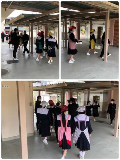 4時間目が終わりました。当番の人たちが給食室にやってきました。