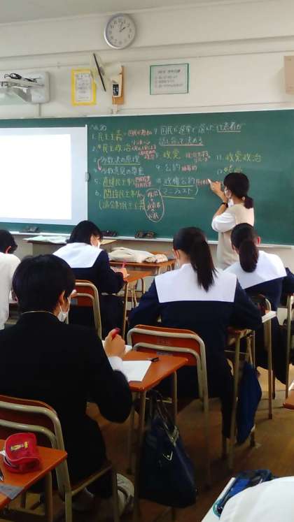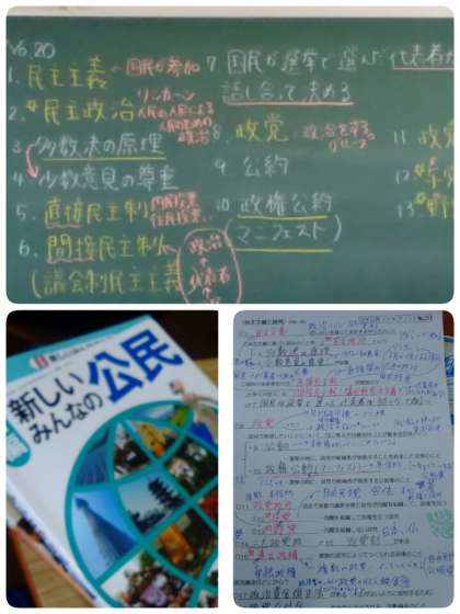 民主政治のしくみや政党の役割について学習しています。プリントをきれいに仕上げています。